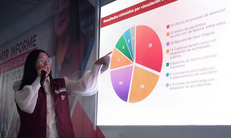 En el trabajo de gestoría individual, destinó 2 millones 897 mil pesos, para atender 468 solicitudes particulares de las y los ciudadanos del distrito IV, en temas principalmente de dignificación de vivienda, proyectos productivos y gastos escolares, atendiendo además como prioridad a personas con discapacidad. Realizó también, 35 asambleas vecinales implementando el ejercicio democrático de presupuesto participativo en cada una, logrando un 61% de avance en los compromisos comunitarios, en los que se incluye rehabilitación de áreas públicas, actividades con la comunidad y apoyos a escuelas y albergues.