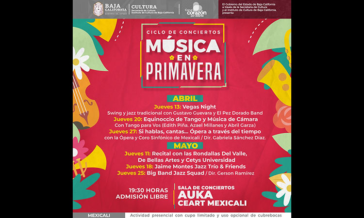 MEXICALI.- El Gobierno del Estado a través de la Secretaría de Cultura de Baja California invita a toda la comunidad a disfrutar del ciclo de conciertos denominado “Música en Primavera” que llevará a cabo en los meses de abril y mayo en la Sala de Conciertos Auka en Mexicali.