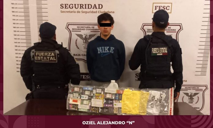 Oziel Alejandro “N”, de 20 años y originario de Chula Vista, California, fue sorprendido sobre la avenida Los Lobos en la colonia Misión de las Californias; tenía entre sus manos una bolsa de plástico en la que guardaba el producto que pretendía comercializar.
