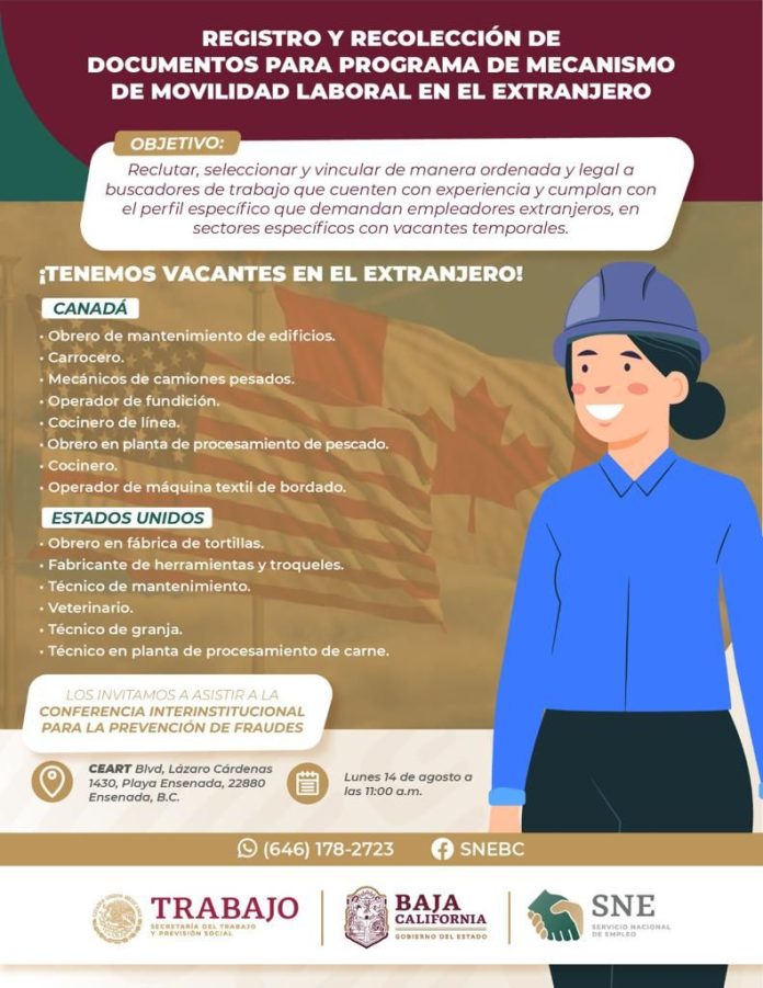 ENSENADA.- Como parte del Programa de Mecanismo Movilidad Laboral, la Secretaría del trabajo y Previsión Social (STPS) en conjunto con el Servicio Nacional del Empleo de Baja California (SNEBC) lanzaron la convocatoria para las personas interesadas en obtener una vacante de trabajo en Estados Unidos o en Canadá.