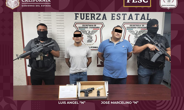 Posteriormente, también en Mexicali, sobre la calle Ciudad Victoria de la colonia La Esperanza fueron detenidos por la Coordinación de Enlace Internacional, José Marcelino “N” y Luis Ángel “N” cuando circulaban a exceso de velocidad en un vehículo Honda Accord color guinda con placas de Baja California; tras una inspección se detectó que dicha unidad contaba con dos impactos de bala en su carrocería, además, se les localizó un arma de fuego.