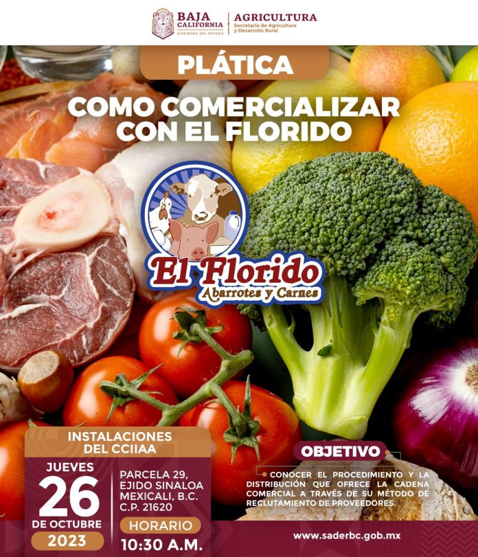MEXICALI.- Con la finalidad de impulsar la comercialización de productos locales en cadenas reconocidas de Baja California, la Secretaría de Agricultura y Desarrollo Rural (SADERBC) invita a la plática “Cómo Comercializar con El Florido”.