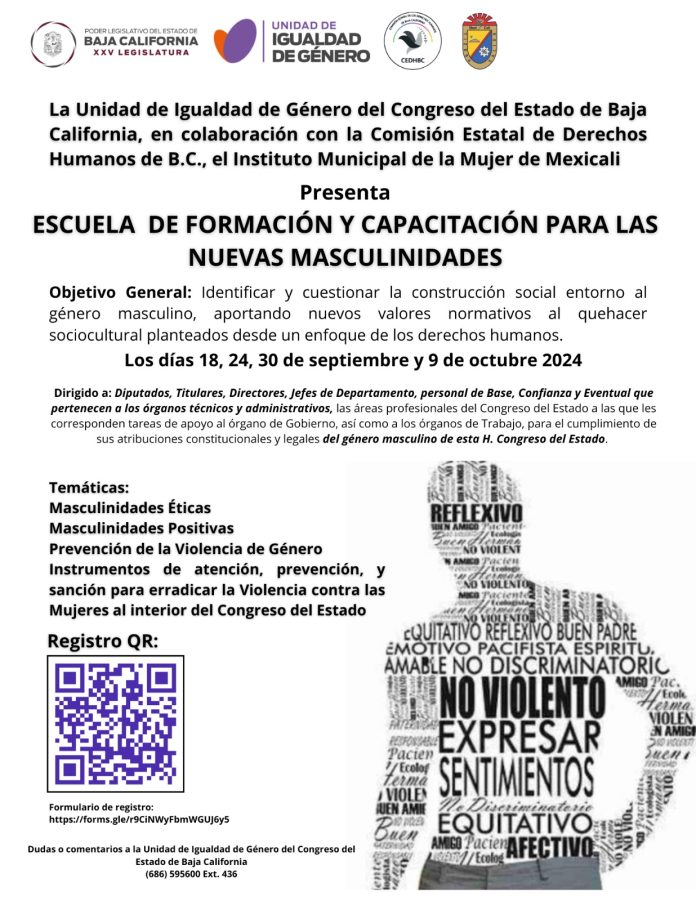 MEXICALI.- El Congreso del Estado de Baja California, a través de la Unidad de Igualdad de Género, emitió una convocatoria a todo el personal masculino que labora en esta entidad, para asistir a la Escuela de Formación de y Capacitación para las Nuevas Masculinidades, con el objetivo de identificar y cuestionar la construcción social entorno al género masculino, aportando nuevos valores normativos al quehacer sociocultural planteados desde un enfoque de los derechos humanos.