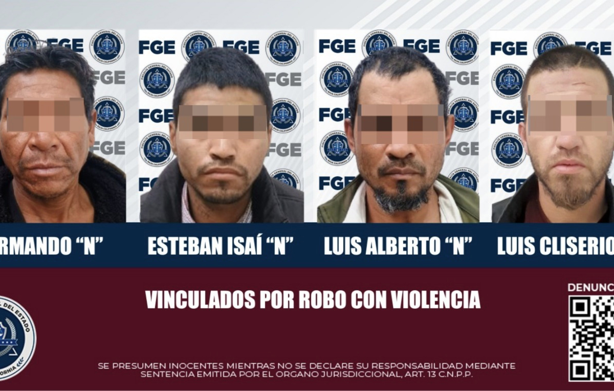 MEXICALI. – La Fiscalía Regional de Mexicali, a través de la Unidad de Investigación de Delitos con Detenidos Poniente, logró que se vinculara a proceso a cuatro individuos acusados de cometer robos con violencia a establecimientos comerciales y a transeúntes.