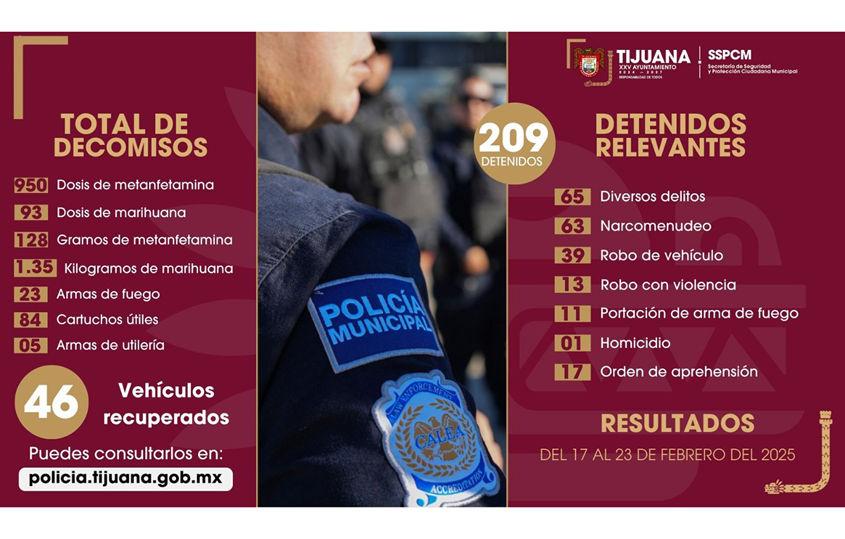 TIJUANA.- La Secretaría Seguridad y Protección Ciudadana Municipal (SSPCM), presentó ante diversas autoridades a un total de 209 personas involucradas en distintos hechos delictivos, retiró de las calles 23 armas de fuego, 84 cartuchos útiles y 5 armas de utilería, que fueron aseguradas durante el periodo del 17 al 23 de febrero.