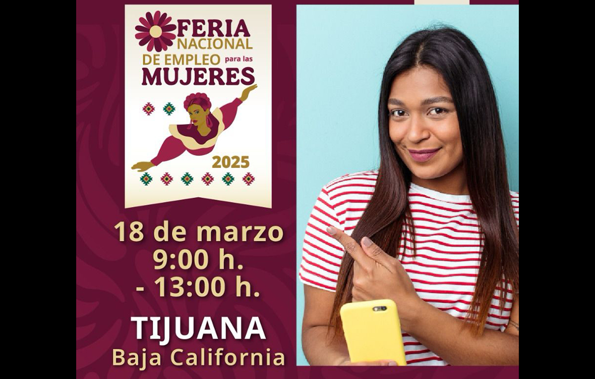 TIJUANA.- La Secretaría del Trabajo y Previsión Social (STPS) invita a la Feria Nacional de Empleo para las Mujeres 2025, la cual se llevará a cabo el 18 de marzo en el Centro de Justicia para las Mujeres (CEJUM) de Baja California.