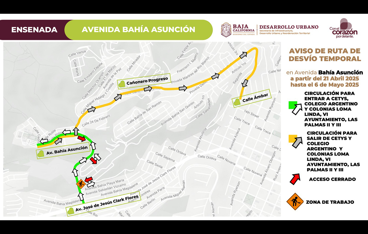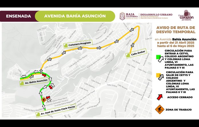 ENSENADA.- Como parte de los trabajos de pavimentación en la avenida Bahía Asunción en Ensenada, la Secretaría de Infraestructura, Desarrollo Urbano y Reordenación Territorial (SIDURT) llevará a cabo un cambio en la ruta de desvío de forma temporal a partir de este lunes 21 de abril de 2025.