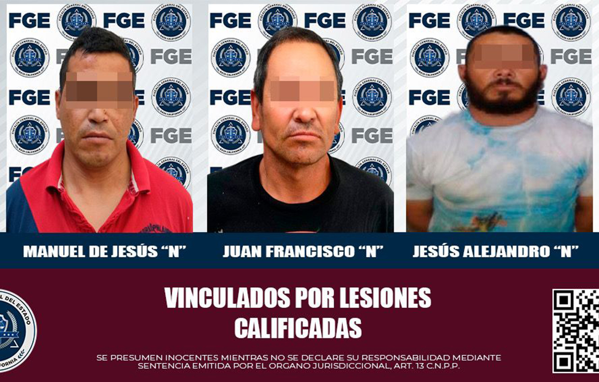 MEXICALI.- La Fiscalía Regional de Mexicali, a través de la Unidad de Investigación con Detenidos Poniente, obtuvo la vinculación a proceso de tres hombres presuntamente implicados en delitos de lesiones calificadas, luego de presentar elementos de prueba contundentes.
