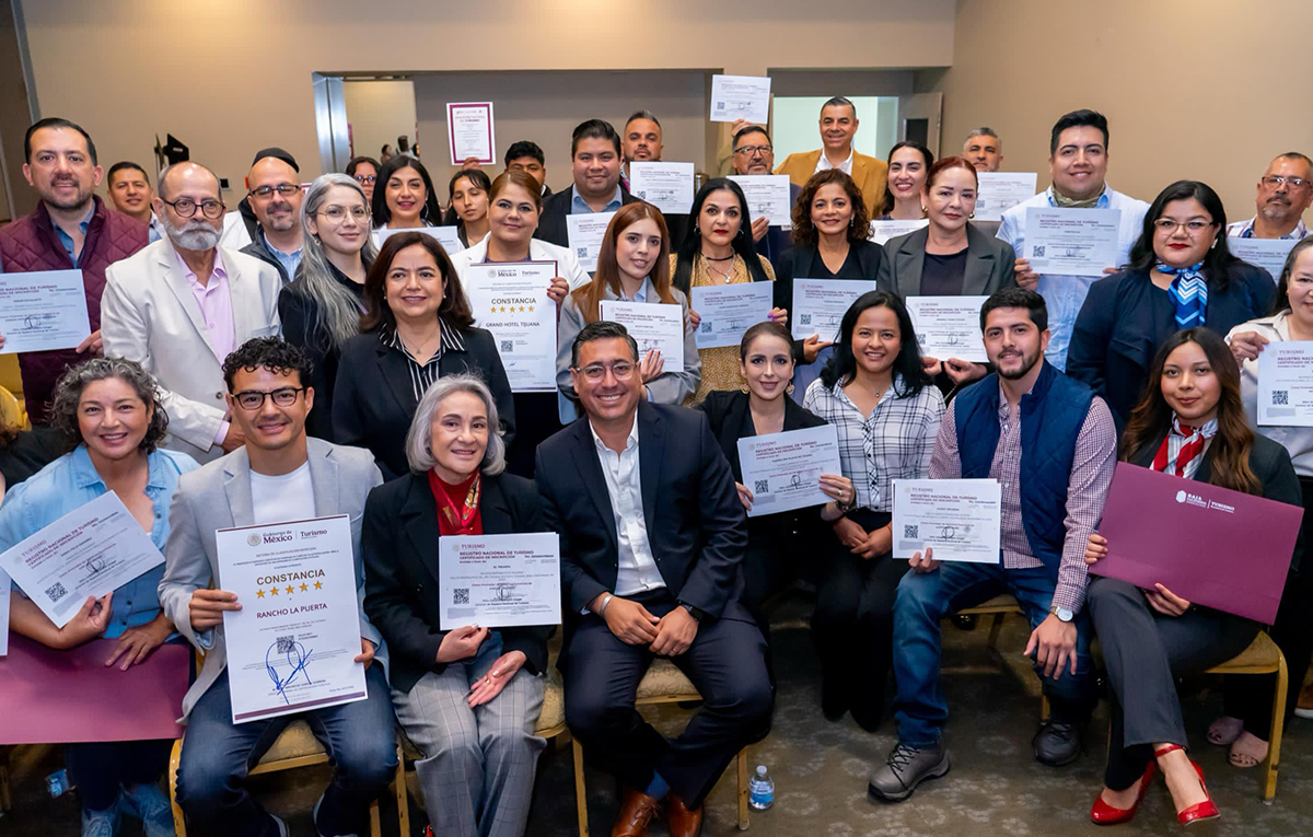 Playas de Rosarito, B.C.– Con el objetivo de seguir fortaleciendo la competitividad y profesionalización del sector turístico en la entidad, el Secretario de Turismo de Baja California, Miguel Aguíñiga Rodríguez, encabezó la entrega de 33 Registros Nacionales de Turismo (RNT), 2 Clasificaciones Hoteleras de 5 estrellas y 3 Distintivos “H” en el Baja California Center.