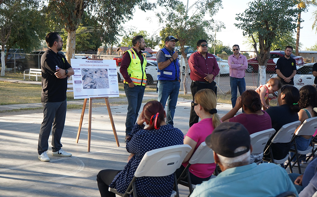 Previo al inicio de la obra, el director de CESPM, Armando Carrazco López, sostuvo una reunión informativa con vecinas y vecinos del poblado El Mezquital, la tarde del jueves 12 de junio en el parque público de la comunidad. Durante el encuentro se presentaron los detalles del proyecto, se resolvieron dudas y se escucharon las inquietudes de las y los residentes.