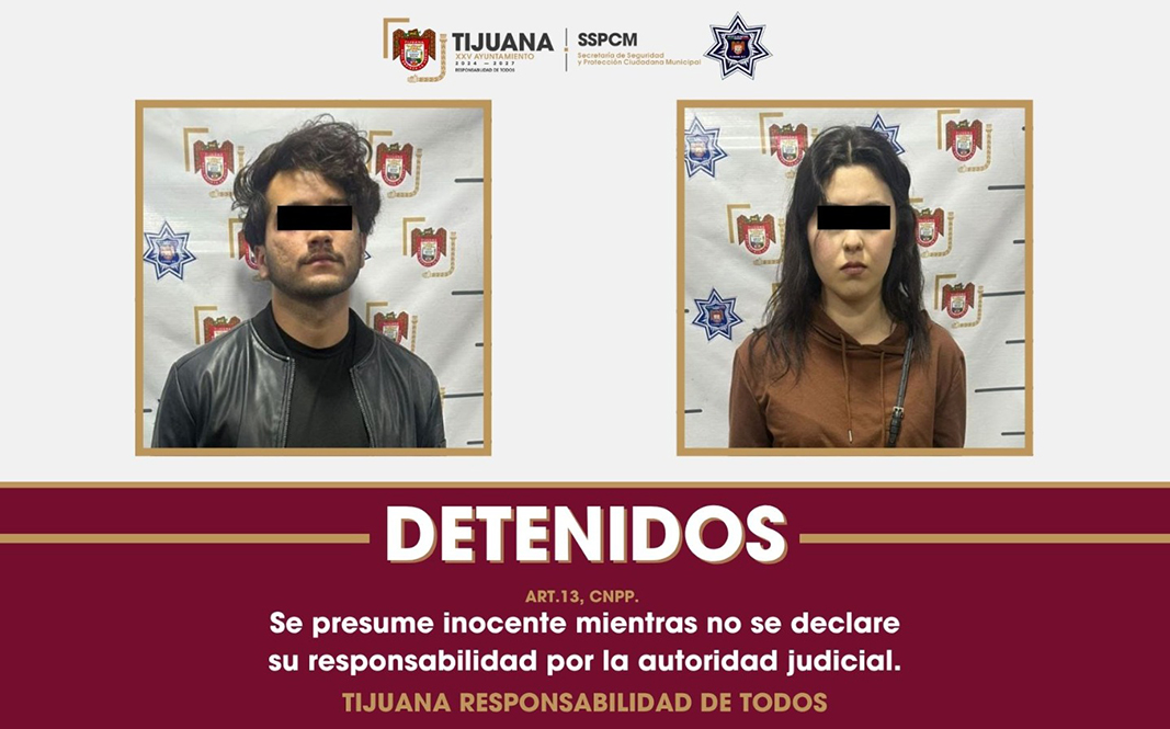 TIJUANA.- Como parte de los patrullajes de vigilancia implementados por la Secretaría de Seguridad y Protección Ciudadana Municipal (SSPCM), agentes de la Policía Municipal lograron la detención de dos personas presuntamente involucradas en un robo con violencia, ocurrido en la colonia Jardín Dorado.