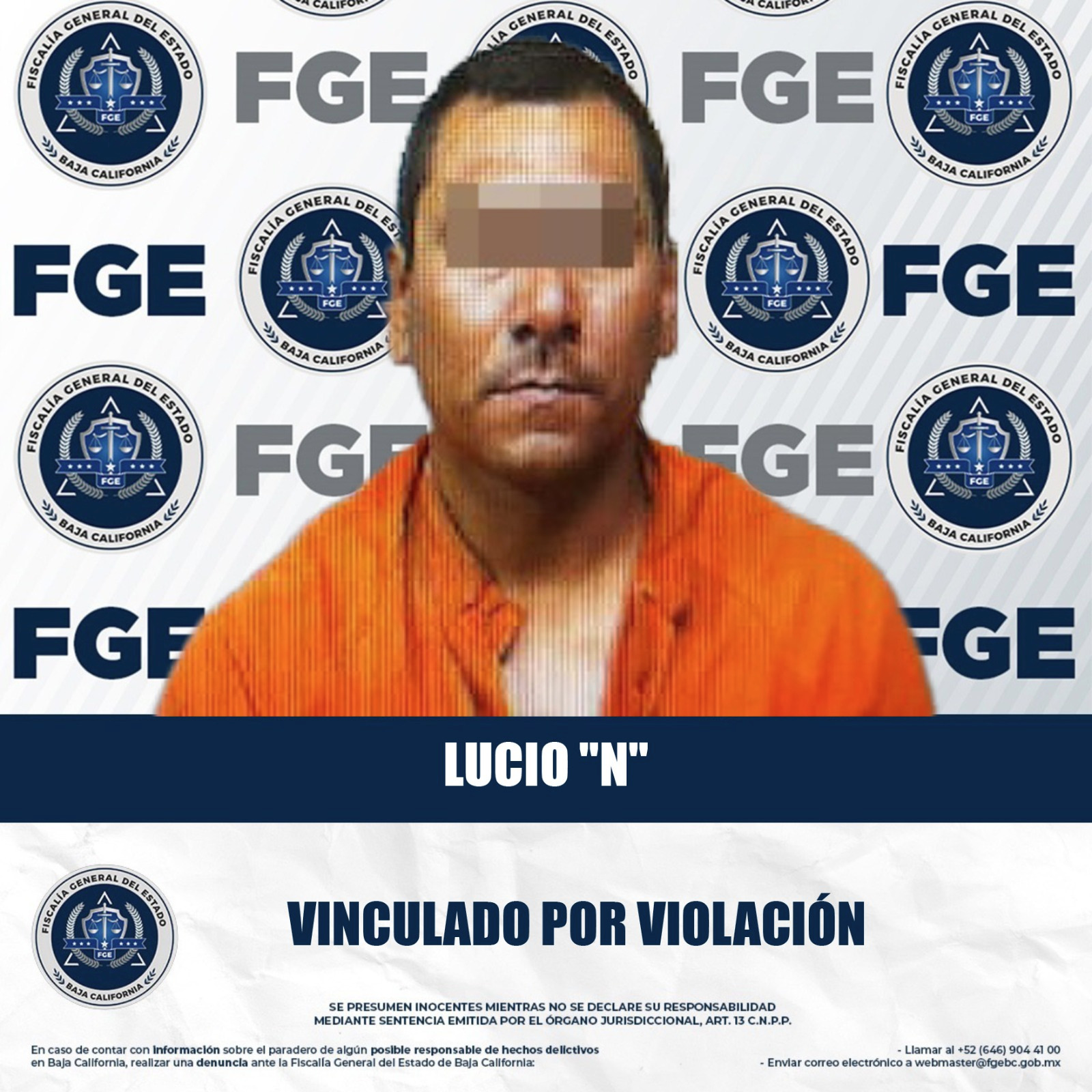 MEXICALI.– La Fiscalía General del Estado obtuvo la vinculación a proceso en contra de Lucio “N”, por su presunta responsabilidad en el delito de violación, ocurrido en el mes de abril de 2023.
