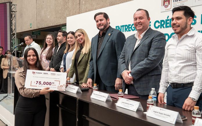 TIJUANA.- Con la finalidad de generar bienestar en las familias tijuanenses, así como impulsar el desarrollo económico de la ciudad, el presidente municipal, Ismael Burgueño Ruiz, encabezó, en Palacio Municipal, la ceremonia de entrega de 484 créditos del Fideicomiso Fondos Tijuana, que representan una inversión superior a los 23 millones de pesos.