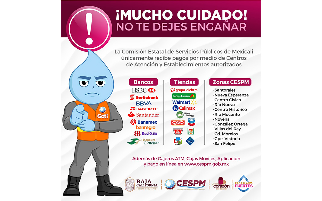 Para quienes prefieran acudir de manera presencial, CESPM dispone de 10 zonas comerciales en la ciudad, el Valle de Mexicali y San Felipe. La ubicación de las oficinas puede consultarse en el siguiente enlace:
