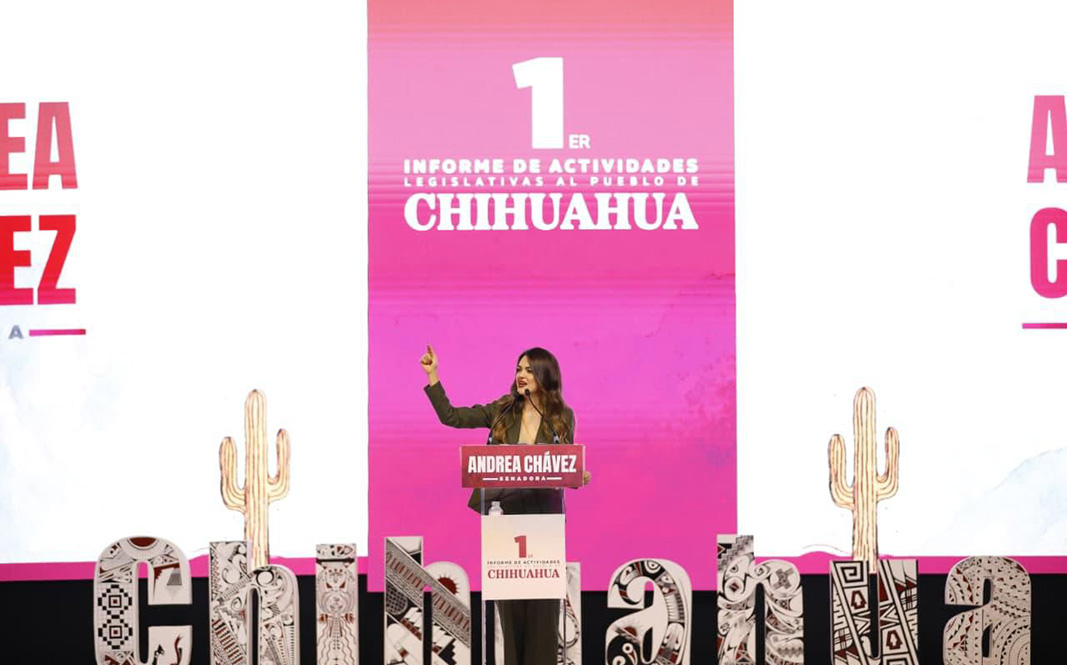 Durante su discurso, la senadora Andrea Chávez subrayó los resultados de la gira “De sol a sol: la vuelta a Chihuahua en 60 días”, que le permitió recorrer los 67 municipios de la entidad y fortalecer el diálogo directo con la población, especialmente en comunidades alejadas como la Sierra Tarahumara.