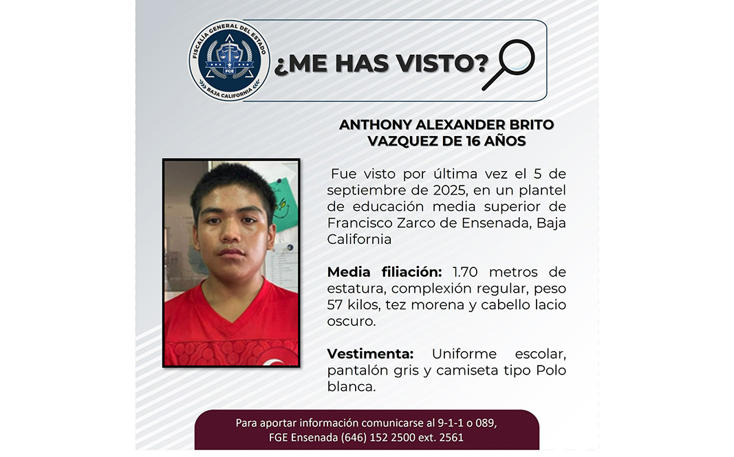 ENSENADA.- La Fiscalía General del Estado solicita la colaboración de la comunidad para localizar a Anthony Alexander Brito Vázquez de 16 años de edad.