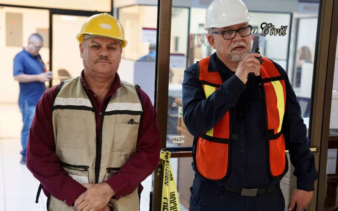 La Unidad Municipal de Protección Civil informó que en este ejercicio participaron aproximadamente 600 personas, entre trabajadores y usuarios, logrando evacuar el Palacio Municipal en 3 minutos y 42 segundos.