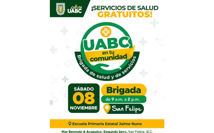 SAN FELIPE.- La Universidad Autónoma de Baja California (UABC) realizará en San Felipe su próxima brigada de salud y servicios UABC en tu Comunidad. Esta tendrá lugar el sábado 8 de noviembre de 9:00 a 14:00 horas en la Escuela Primaria Estatal Jaime Nuno con dirección en Mar Bermejo y Acapulco, Segunda Sección.