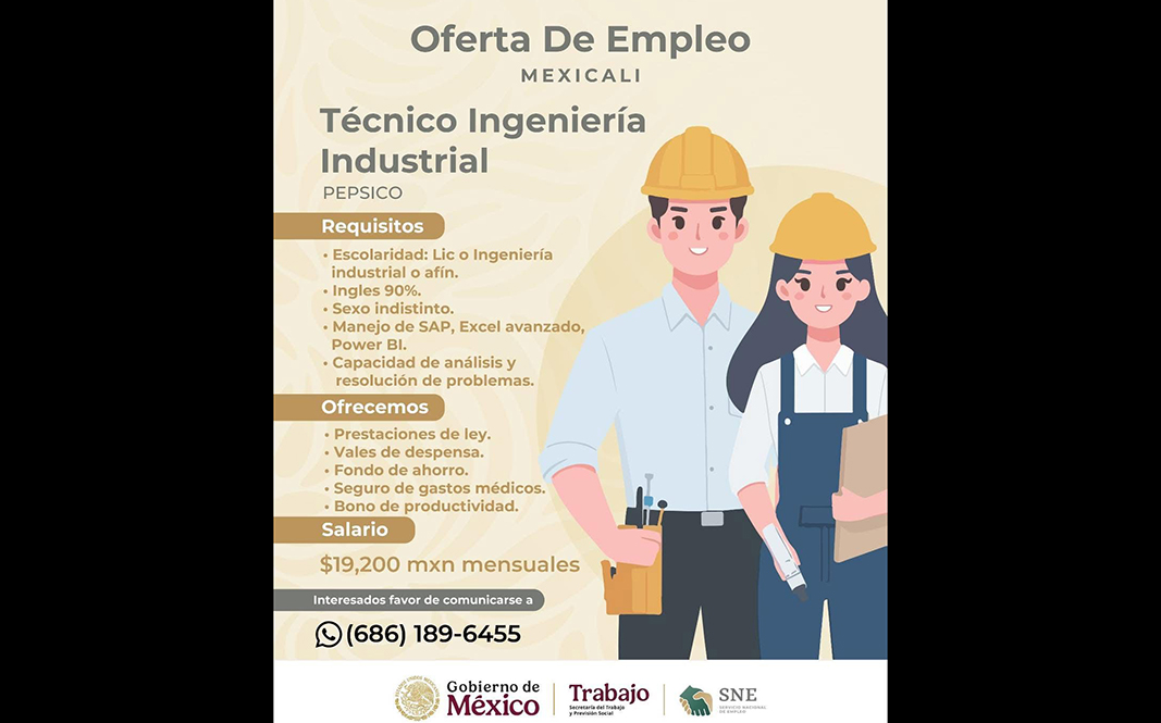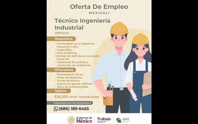 MEXICALI.- La Secretaría del Trabajo y Previsión Social de Baja California (STPS), a través del Servicio Nacional de Empleo (SNE), dio a conocer nuevas vacantes disponibles en Mexicali, dirigidas a personas que buscan incorporarse al sector productivo, pero con opciones formales y estables.