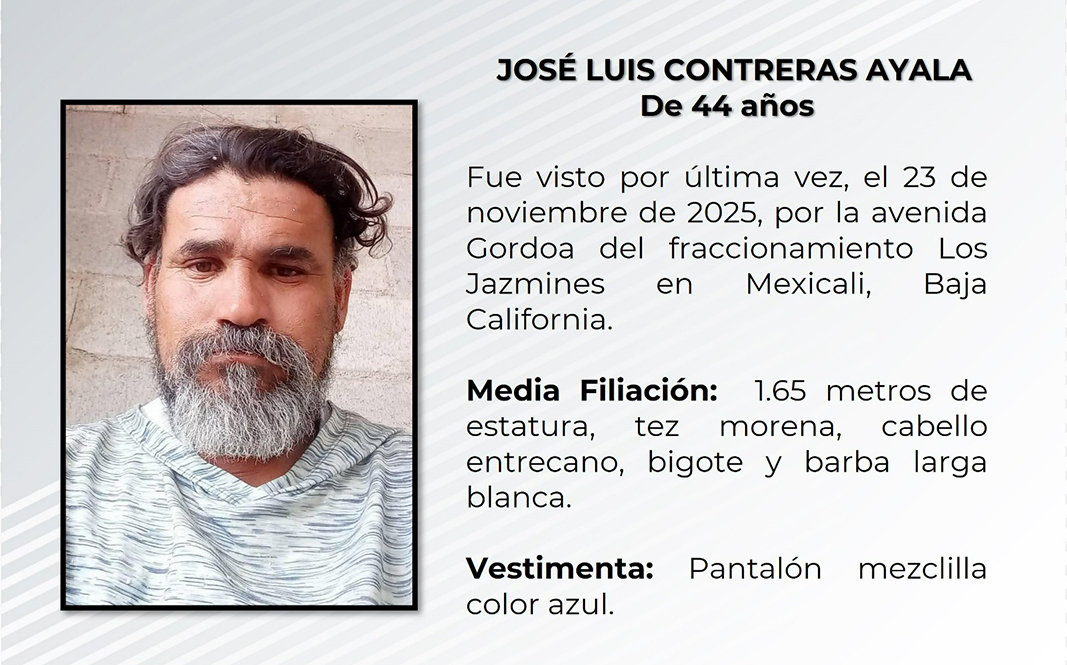 EXICALI.- La Fiscalía General del Estado (FGE), a través de la Unidad de Investigación de Delitos Contra las Personas y su Libertad, solicita la colaboración de los ciudadanos para localizar a José Luis Contreras Ayala de 44 años.