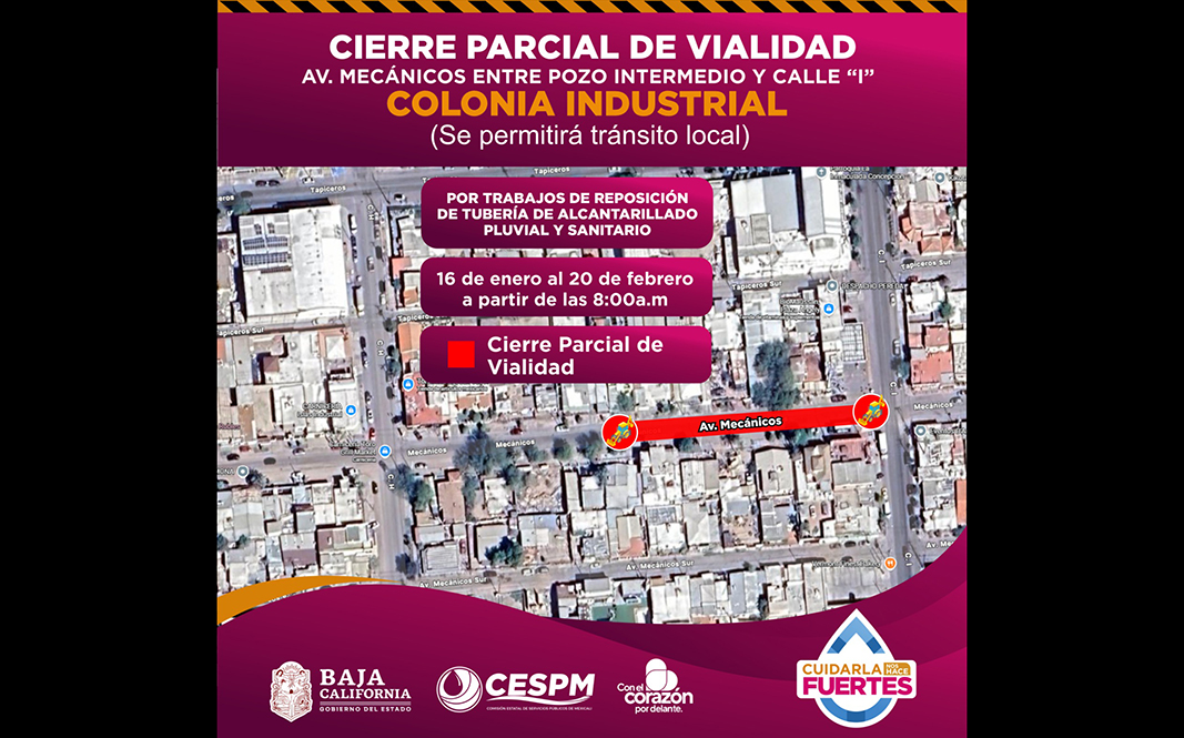 La reposición de tubería iniciará este 16 de enero en punto de las 8:00 de la mañana. Previo al arranque formal de la obra, el miércoles 15 de enero se llevará a cabo una reunión informativa con vecinos y usuarios de la zona, en la esquina de la avenida Mecánicos y la calle “I”, en un horario de 4:00 a 4:30 de la tarde, con el objetivo de dar a conocer los alcances del proyecto y atender dudas de la comunidad.