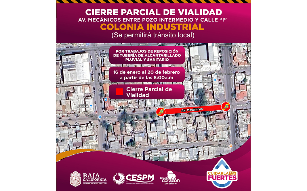 La reposición de tubería iniciará este 16 de enero en punto de las 8:00 de la mañana. Previo al arranque formal de la obra, el miércoles 15 de enero se llevará a cabo una reunión informativa con vecinos y usuarios de la zona, en la esquina de la avenida Mecánicos y la calle “I”, en un horario de 4:00 a 4:30 de la tarde, con el objetivo de dar a conocer los alcances del proyecto y atender dudas de la comunidad.