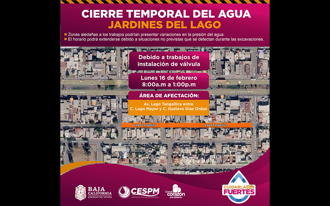 MEXICALI.– La Comisión Estatal de Servicios Públicos de Mexicali (CESPM) informó que este lunes 16 de febrero se realizará un cierre temporal del servicio de agua potable en el fraccionamiento Jardines del Lago, debido a trabajos de instalación de válvula como parte de las acciones de mejora en la red hidráulica.
