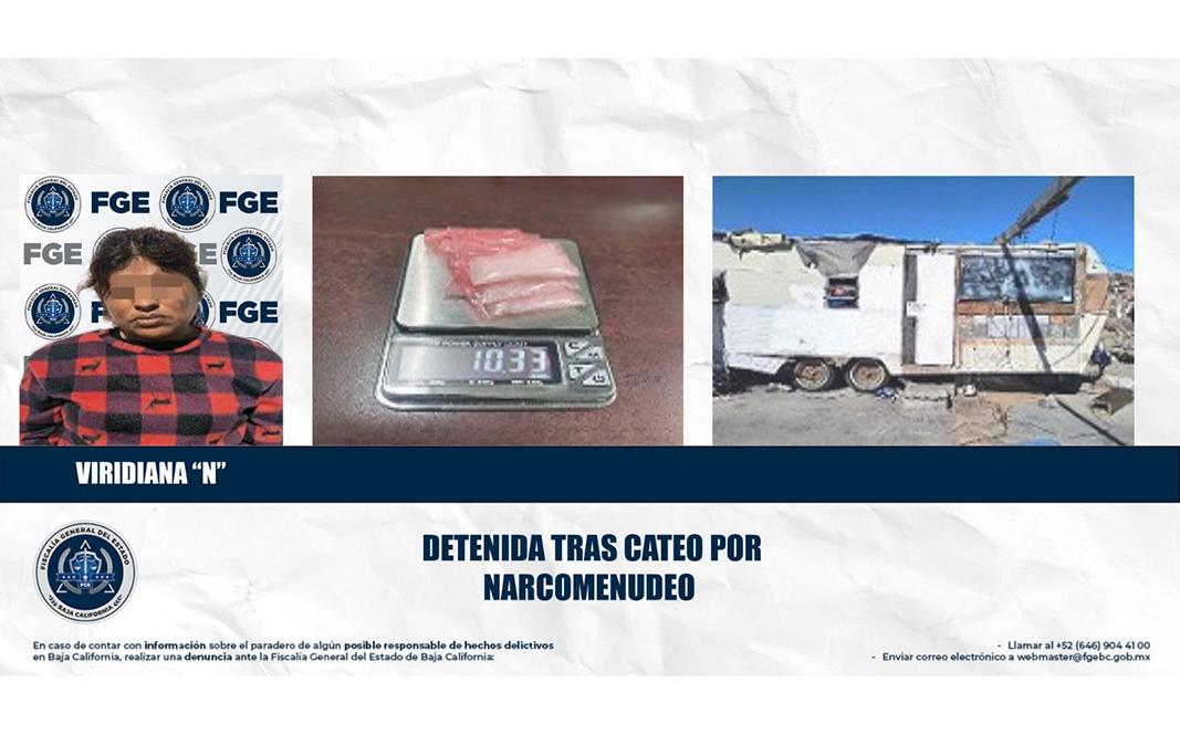 Durante el operativo se logró la detención de Viridiana “N”, así como el decomiso de diversos narcóticos, entre los que destacan seis envoltorios de plástico color rosa con sello de grapa metálica, los cuales contenían en su interior una sustancia color blanco con las características de la droga conocida como metanfetamina, además del aseguramiento del domicilio en cuestión.