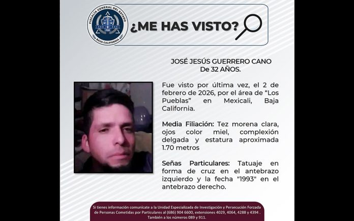 MEXICALI.- La Fiscalía General del Estado, a través de la Unidad para la Investigación y Persecución de Delitos de Desaparición Forzadas de Personas y Desaparición Forzada cometida por Particulares solicita la colaboración de los ciudadanos y medios de comunicación para localizar a José Jesús Guerrero Cano de 32 años.