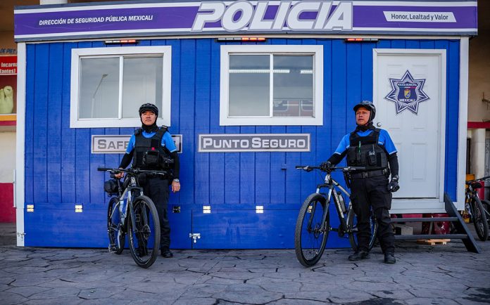 Asimismo, resaltó la instalación de una caseta de policía ubicada frente a la Garita Mexicali I y el Hotel del Norte. Explicó que este punto de vigilancia fue posible gracias a la colaboración de la Asociación Mexicana de Hoteles y Moteles de Mexicali, quienes donaron la estructura que posteriormente fue equipada por la DSPM.