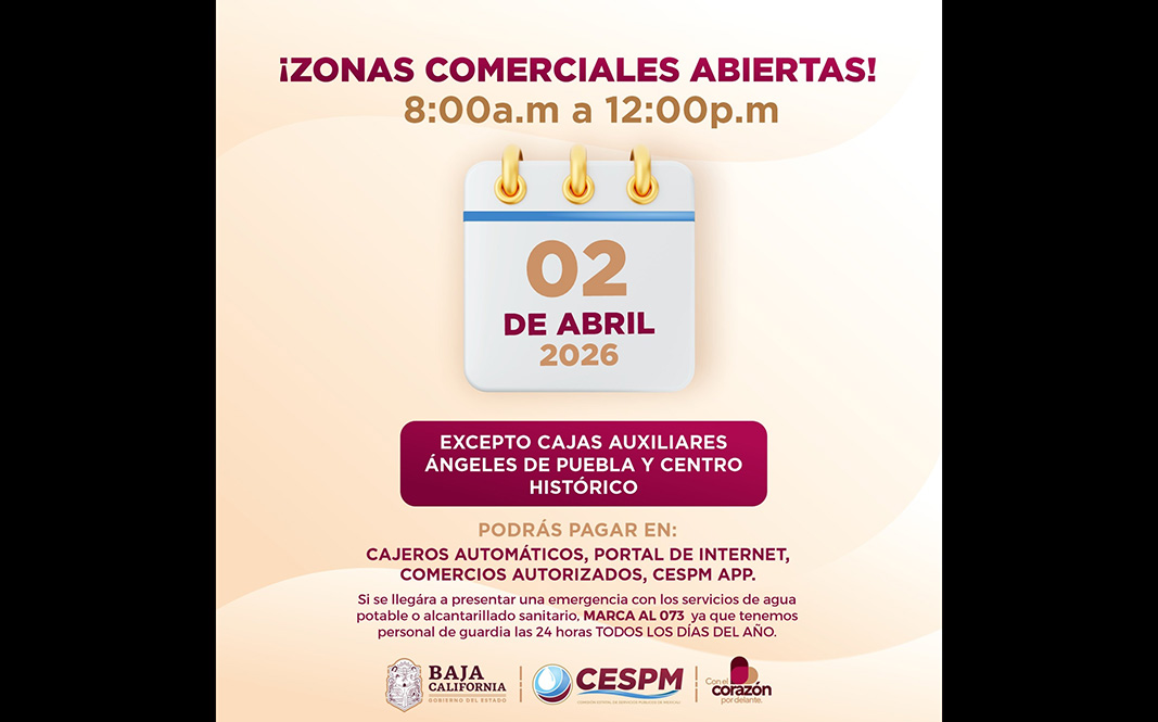 Mexicali. — La Comisión Estatal de Servicios Públicos de Mexicali (CESPM) informó sobre las opciones disponibles para que la ciudadanía realice trámites y pagos durante el periodo de asueto con motivo de la Semana Santa.
