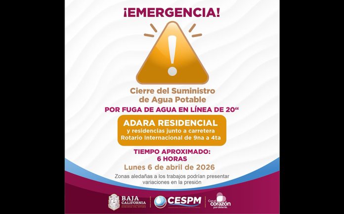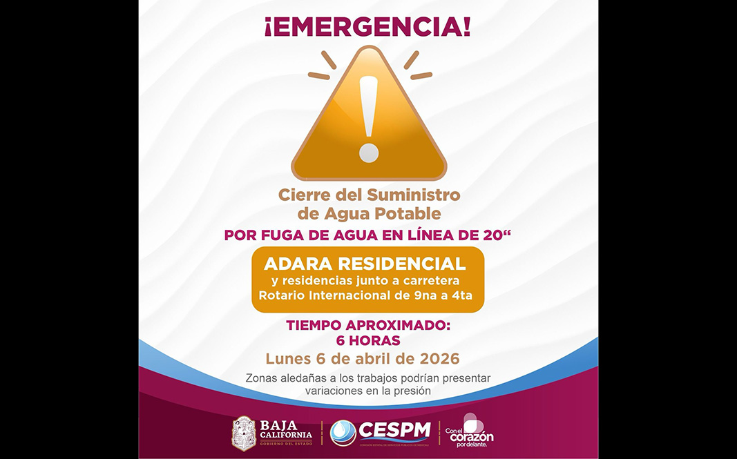 MEXICALI.— La Comisión Estatal de Servicios Públicos de Mexicali (CESPM) informó sobre la realización de trabajos emergentes y programados que implicarán el cierre temporal del suministro de agua potable, así como la suspensión total de la circulación en un tramo del bulevar Venustiano Carranza.