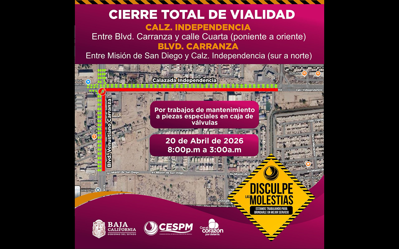 MEXICALI.– La Comisión Estatal de Servicios Públicos de Mexicali (CESPM) informa a la ciudadanía sobre el cierre total de importantes tramos viales, derivado de trabajos de mantenimiento en infraestructura hidráulica.