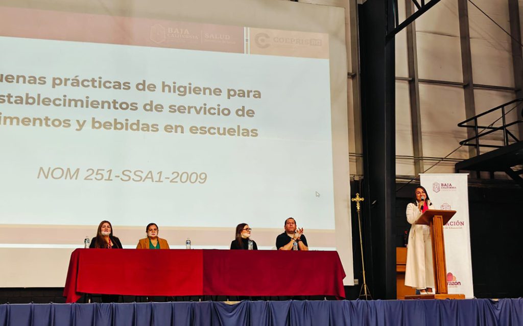 La secretaria de Educación en Baja California, Mtra. Irma Martínez Manríquez, explicó que esta dependencia trabaja de manera coordinada con la Secretaría de Salud y la COEPRIS, con el fin de asegurar el cumplimiento de las normas de higiene y seguridad.
